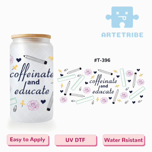 16oz uvdtf Teachers' Day coffeinate and educate coffee pencil ruler rose heart pin floral pattern Boho--#T-396