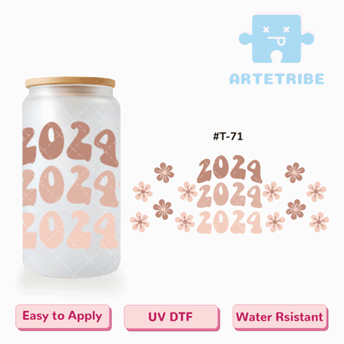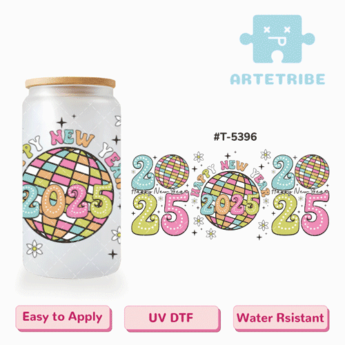 16oz uvdtf 2025 HAPPY NEW YEAR Disco light blue green pink tone flowers--#T-5396
