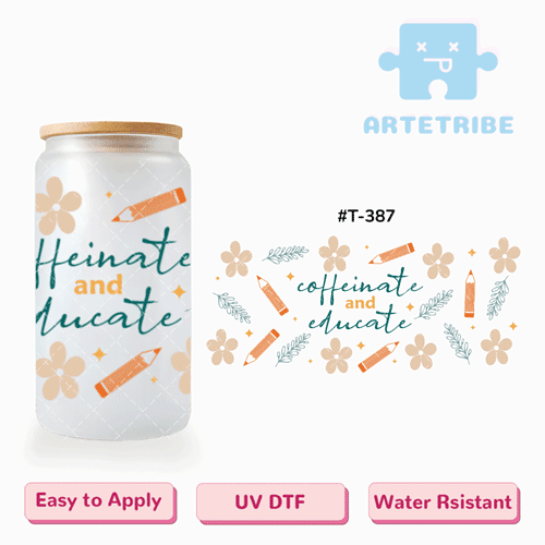 16oz uvdtf Teachers’ Day coffeinate and educate brown flower orange pencil floral pattern Boho--#T-387