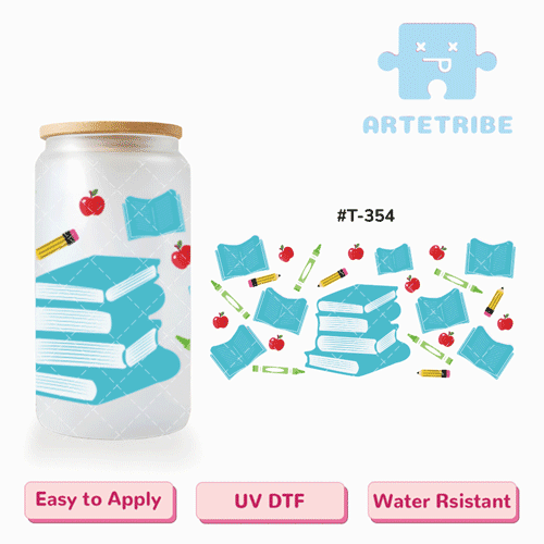 16oz uvdtf blue books green crayons yellow pencils red apples-#T-354