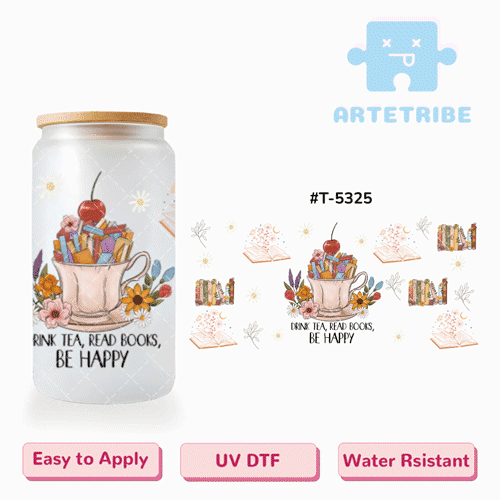 16oz uvdtf World Book and Copyright Day DRINK TEA READ BOOKS BE HAPPY a cup of books Boho--#T-5325