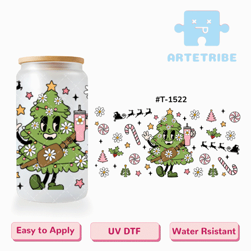 16oz uvdtf Merry Christmas Colored string lights Spotted pattern tractor pine Santa hat--#T-787