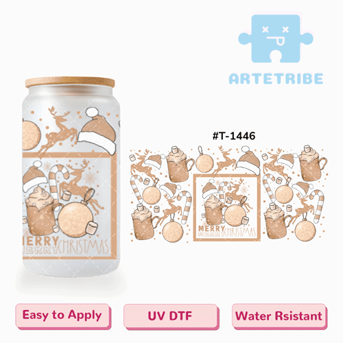 16oz uvdtf Merry Christmas coffee disco light candy cane marshmallow Cinnamon blue brown tone--#T-1443