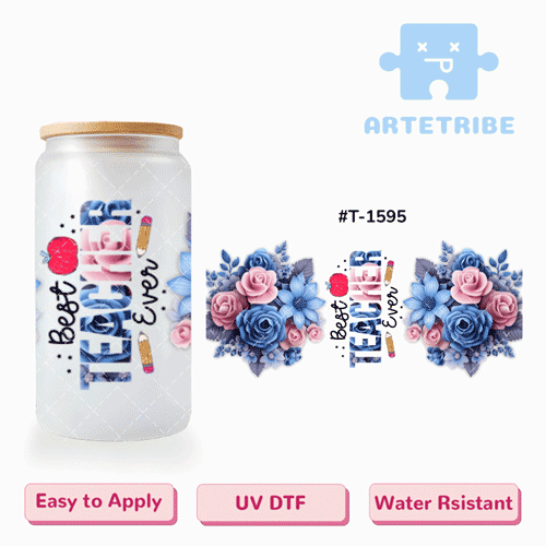 16oz uvdtf Teachers' Day Beast TEACHER Ever with blue pink tone flowers--#T-1595