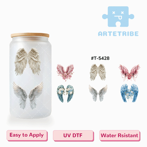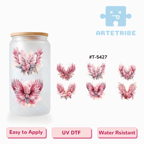 16oz uvdtf pink white blue angel wings flowers--#T-5428