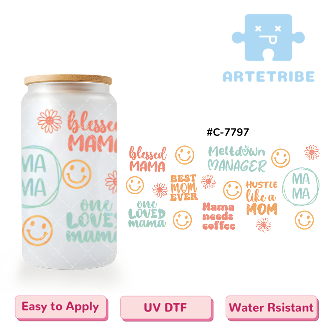 16oz uvdtf Mother's Day blessed mama best mom ever one loved mama coffee smilely face flower Macaron Colors Boho--#C-7797