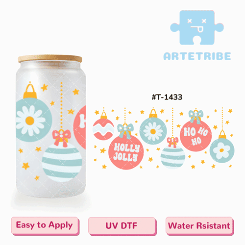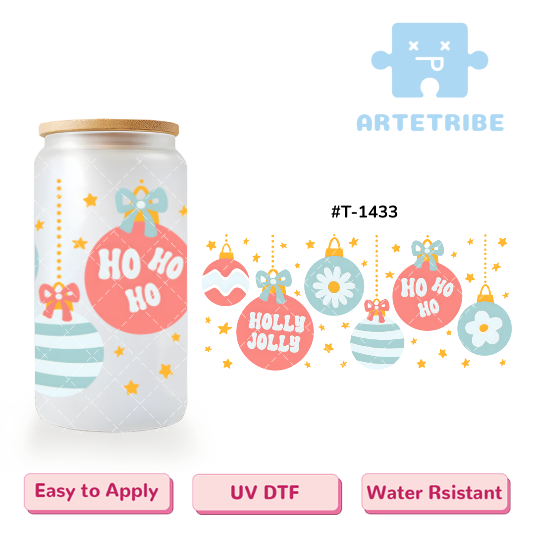 16oz uvdtf Merry Christmas HOLLY JOLLY HO colorful balls star blue red tone Boho--#T-1433